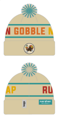 A race pom pom beanie is included with CHIP-TIMED bib registration only. The hat says "RUN, GOBBLE, NAP".