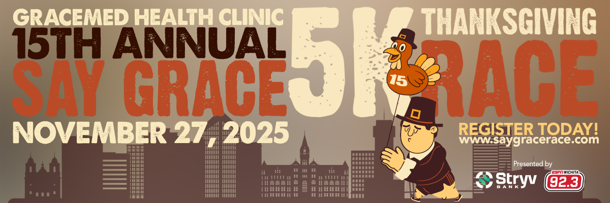 The Say Grace Race is GraceMed’s signature fundraising event and is also Wichita’s largest local 5K race. The annual family-friendly event has become a Thanksgiving tradition for many in our community. We invite you to come out with family and friends to run, walk, or stroll through Midtown, one of Wichita’s most historic neighborhoods. Then enjoy all your holiday indulgences GUILT FREE! Participant perks include: CHIP timing, race t-shirt, finisher medal, unique awards for overall and age-group winners, team awards, fruit and water.